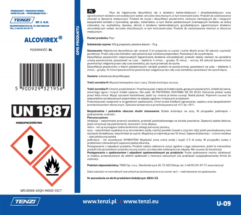 Płyn do dezynfekcji rąk, narzędzi, powierzchni TENZI, Alcovirex, 5l - TNPL-WUU009A005AU000