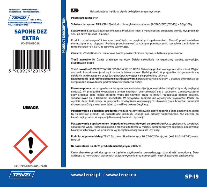 Mydło w płynie biobójcze TENZI, bezzapachowe, Sapone Dez Extra, 5l - TNPL-WSP019A005AU010