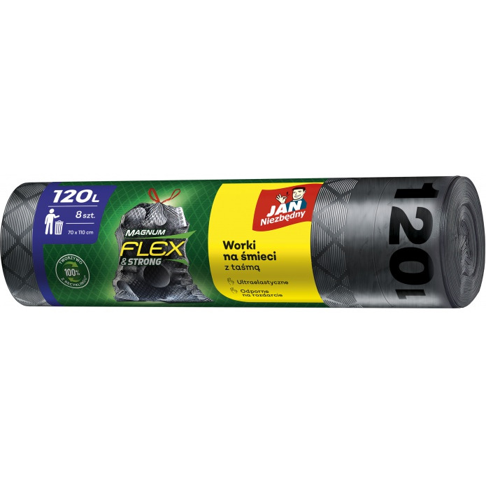 Worki na śmieci JAN NIEZBĘDNY, magnum flex&strong, LDPE, z taśmą, 120l, 8szt., czarne - SA-JN-312736