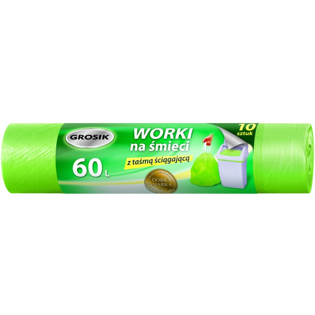 Worki na śmieci z taśmą GROSIK, HDPE, 60l, 10 szt., zielone - SA-GR-224992