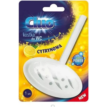 Tradycyjna kostka toaletowa Cluo wraz z przywieszką, wspomagająca zachowanie prawidłowej higieny w misce ustępowej.