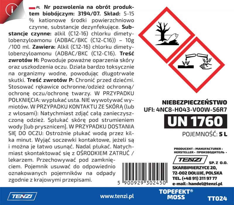 Preparat biobójczy do usuwania grzybów, mchów, glonów TENZI, Topefekt Moss, 5l - TNPL-WTT024A005AN000