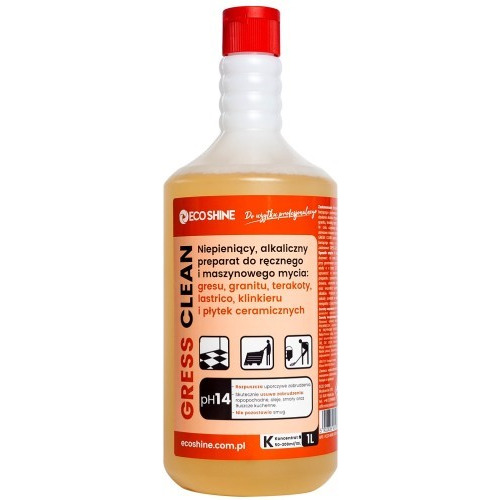 Gress Clean to wysokowydajny, niepieniący środek alkaliczny przeznaczony do ręcznego i maszynowego mycia gresu, granitu, terakoty, lastrico, klinkieru oraz płytek ceramicznych. Skutecznie rozpuszcza uporczywe zabrudzenia, w tym tłuszcze, smary oraz zabrudzenia ropopochodne, nie pozostawiając smug. Regularne stosowanie zapewnia czystość i świeży wygląd powierzchni, a dla jeszcze lepszego efektu zaleca się okresowe stosowanie Gress Acid.