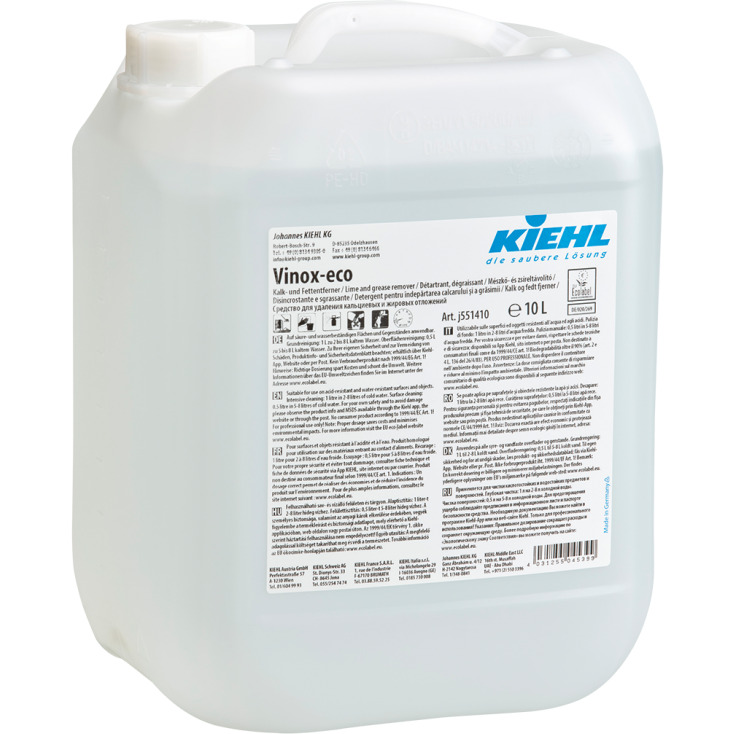 Szybkodziałający, wysokoaktywny środek czyszczący na bazie ekologicznych kwasów do usuwania wapnia i tłuszczu. Przyjazne dla środowiska naturalnego składniki produktu Vinox-eco umożliwiają intensywne rozpuszczanie wapnia i znakomite emulgowanie zbrudzeń olejowych i tłuszczowych. Vinox-eco jest wolny od substancji zapachowych i barwników, dlatego też doskonale nadaje się do obszaru kuchennego i zakładów przemysłu spożywczego.
